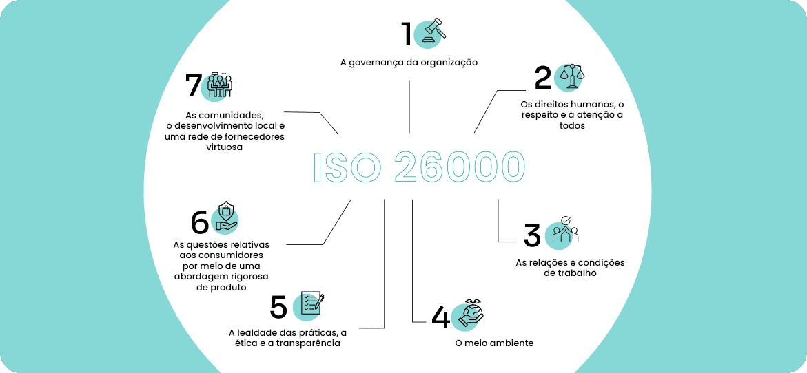 Em termos de estrutura, baseamo-nos na ISO 26000, pelo seu rigor, por sua abordagem holística, mas também por sua contribuição aos Objetivos de Desenvolvimento Sustentável (ODS) da Organização das Nações Unidas.